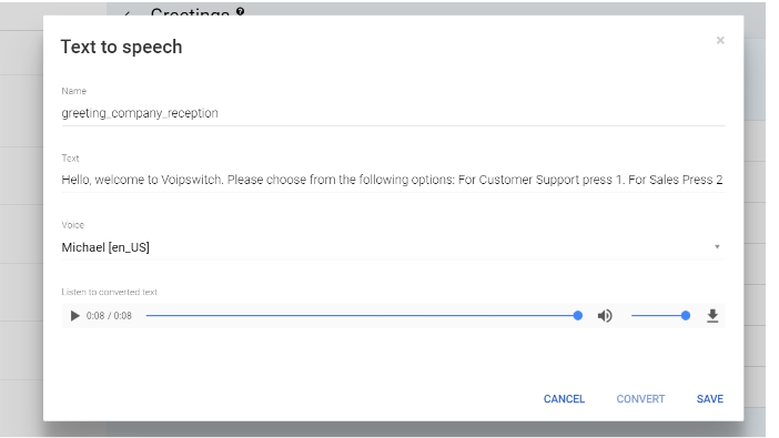 - Text to speach, Type out your greeting and let our AI convert it to AUDIO. Select gender and language for the voice you want to hear on your greeting.